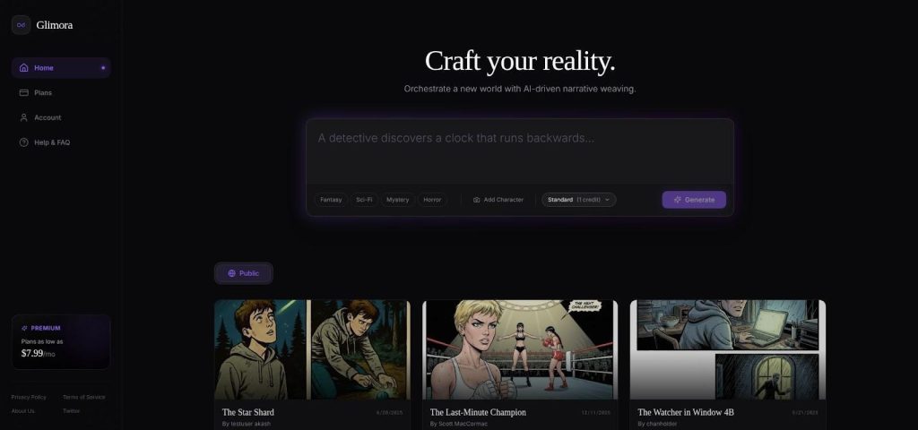 Glimora runs on credits because every branch produces text, art, and audio together. The free tier covers two complete stories, enough to test the fit. After that, $7.99 per month funds a steady stream of interactive tales, useful for teachers, streamers, or parents crafting bedtime plots on demand.