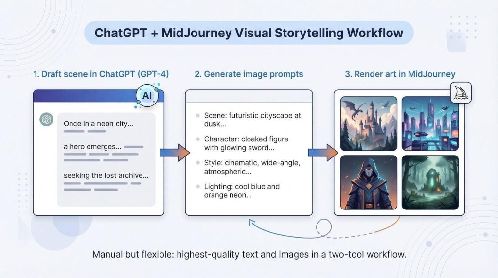 Most creators follow a simple rhythm. Outline in ChatGPT, coaching GPT-4 to lock tone, pacing, and character nuance. When a scene clicks, ask the same chat to produce image prompts, complete with style tags and aspect ratios. Paste those lines into MidJourney on Discord, watch the bot render gallery-worthy art, then loop back for tweaks.