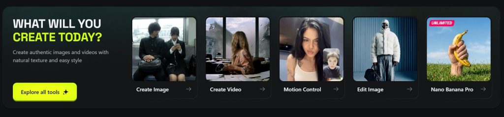 Higgsfield also provides access to premium models like Sora 2, Kling 2.6, and their Nano Banana Pro for image generation. However, the platform’s focus remains primarily on video, and its image generation capabilities, while solid, don’t match the breadth of options available in Freepik.
