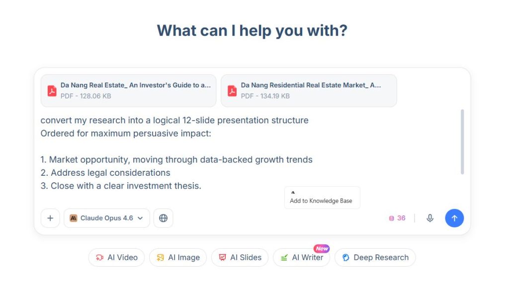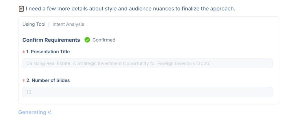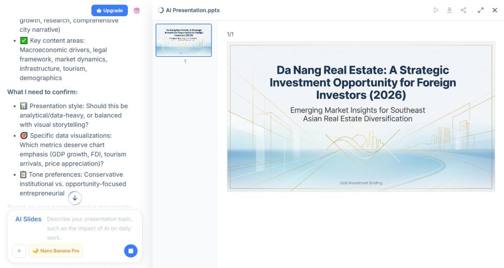 Having all of this happen in one continuous conversation, with full context from the research phase, meant the AI’s suggestions were actually relevant. It wasn’t generating generic business slide copy — it was writing specifically about Vietnamese real estate with the data to back it up.
