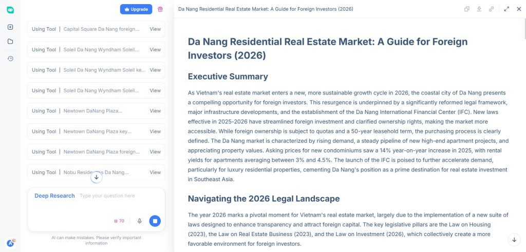 I entered a straightforward prompt: research the current state of Vietnam’s real estate market for foreign investors, covering price trends, legal frameworks, high-growth regions, and projected returns.