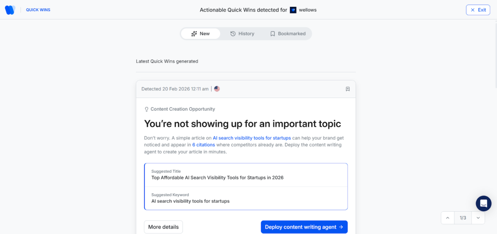 Quick Wins surfaces important AI visibility updates without requiring deep analysis. Instead of digging through reports, you immediately see meaningful changes and suggest next steps.