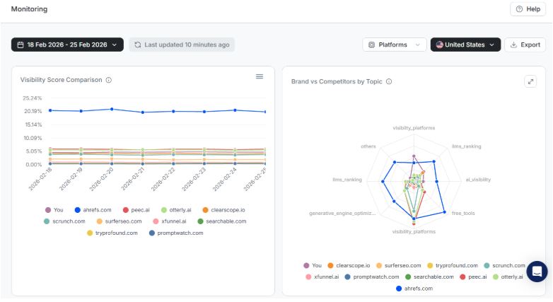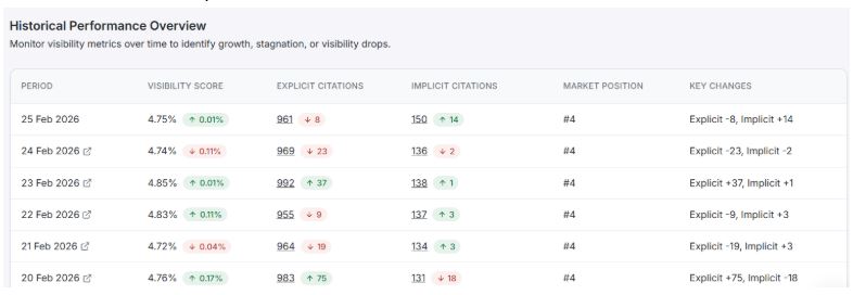 Visibility inside AI platforms is not static. This section helps you understand how your presence evolves over time and how competitors are gaining or losing momentum.
