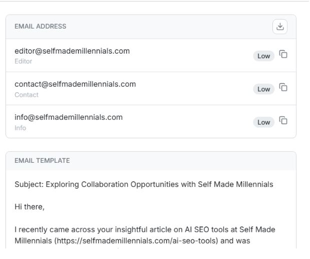 5. Open the contact view to access publisher contact details and a ready-to-use outreach message template